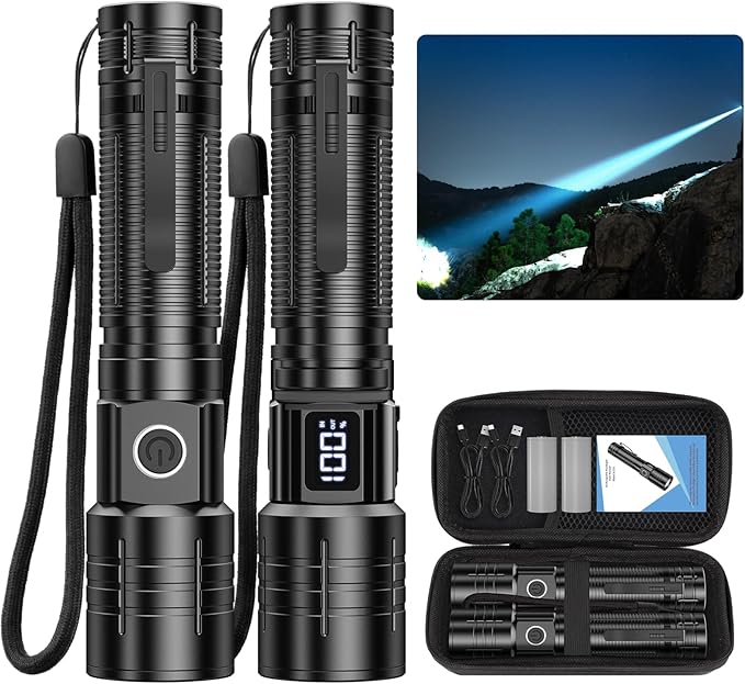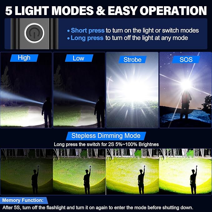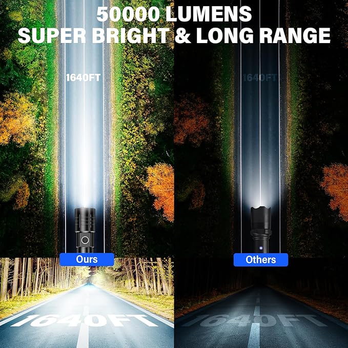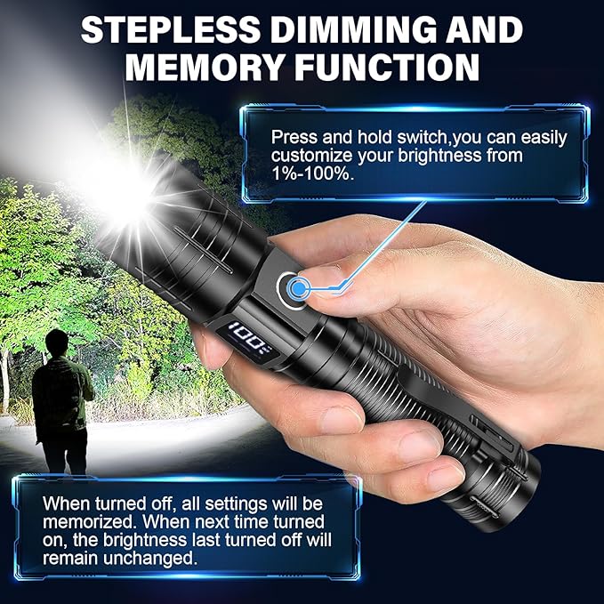 - Super Bright Flashlight & Memory Function: Delivering up to 100000 lumens, this brightest flashlight can illuminate distances up to 1640 feet. The memory function automatically restores the last used mode, ensuring convenience in repeated use. high lumens flashlights perfect for outdoor adventures, emergencies