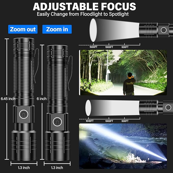 - 5 Modes & Adjustable Focus: This zoomable flashlight features 5 light modes (high/low/strobe/SOS/stepless dimming), and the one-button design can easily cycle through the five modes. Double click the switch to enter TURBO mode (Brightest modes). You have the flexibility to choose the perfect lighting for any scenario