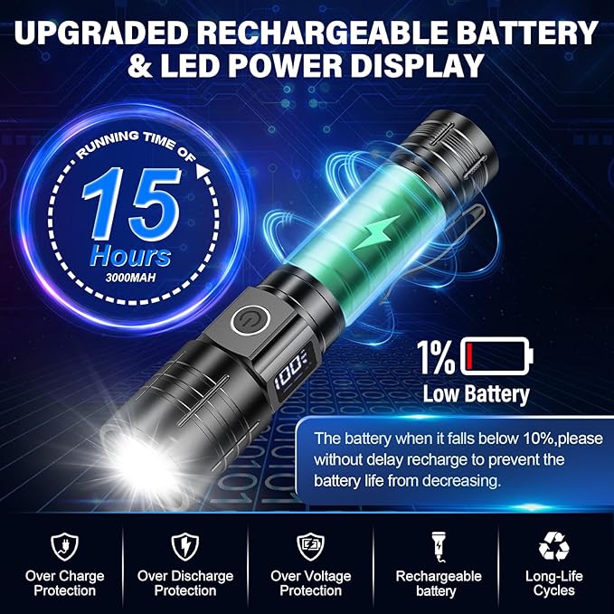 - Waterproof & Power Display: Made from aircraft-grade aluminum alloy, featuring an IPX5 waterproof rating, can keep working during hard rain, waterproof enough to encounter most situations. Built to withstand tough conditions, this small flashlight powerful is both waterproof and shockproof. The led rechargeable flashlight power display lets you know the power status of the handheld flashlights in real time