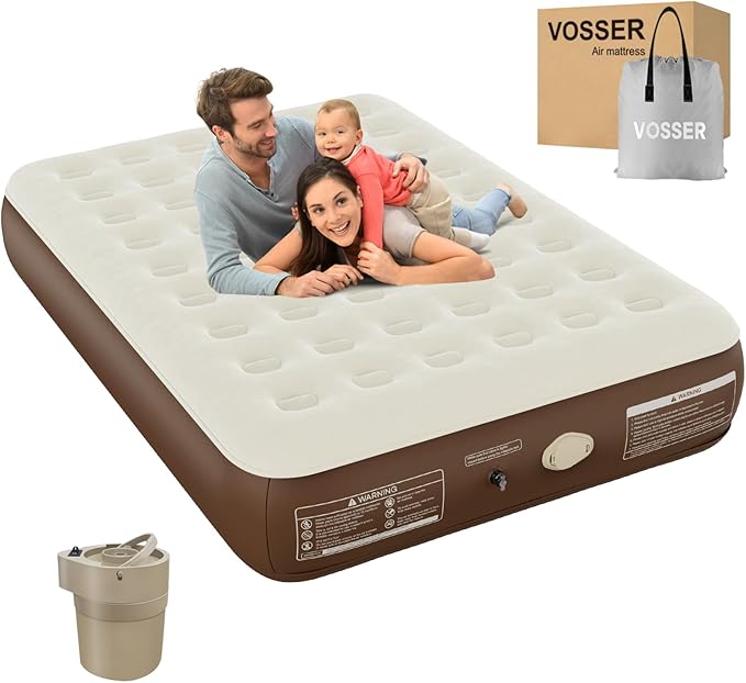 - 【Versatile & Convenient】 The VOSSER queen air mattress comes with a storage bag for easy transport and storage, weighing only 17 lbs. It includes a charging cable for the pump, allowing for convenient recharging on the go. Perfect for camping trips, overnight guests, and family visits, it’s a versatile choice for any adventure