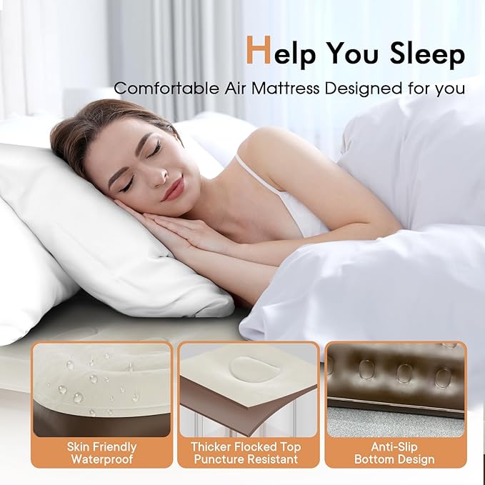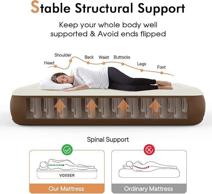 - 【Luxurious Flocked Top and 0.4mm Upgraded PVC】Patented Design (US012108880B2), The VOSSER air mattress features a soft flocked microfiber top layer, designed to prevent air leaks and maintain stability. Its waterproof and puncture-resistant PVC construction, combined with indented sides that hold fitted sheets perfectly in place, ensures the mattress stays secure while minimizing noise for a peaceful sleep