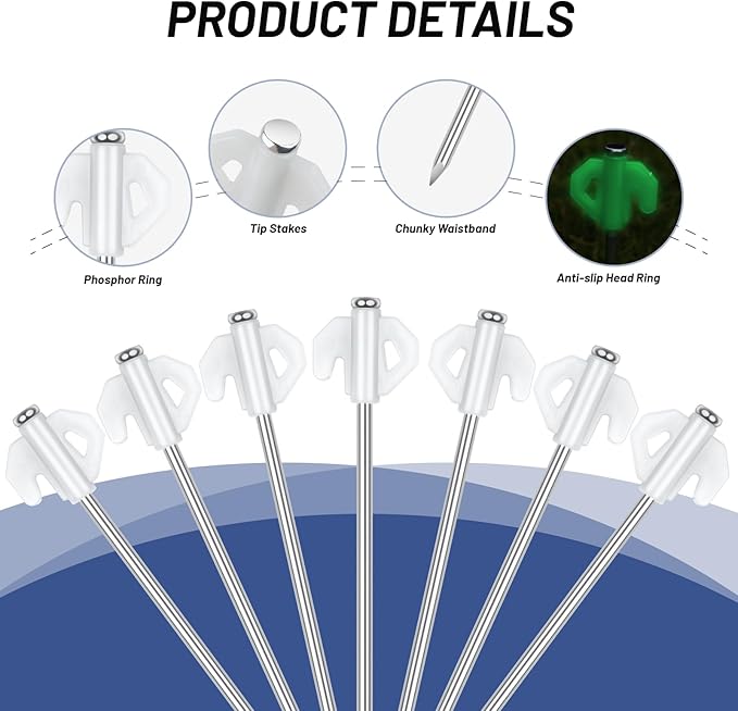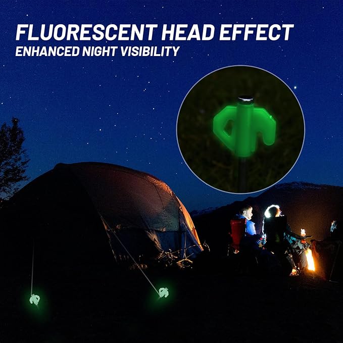 - 【FLUORESCENT NIGHT VISION】New fluorescent ring on top of tent stake can make you clearer about the position of the pegs when you walk at night to avoid tripping, and it can provide you with a quicker positioning of the tent.