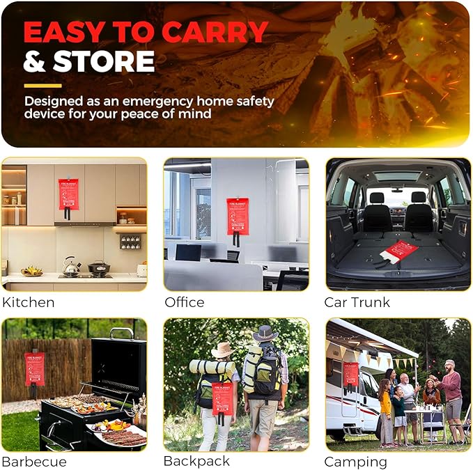 - Rapid Fire Suppression: Quickly and effectively smother fires in your kitchen, home, car, office, or campsite with our fire extinguisher blanket. Designed for emergency use, fire suppression blanket can extinguish flames by cutting off the oxygen supply.