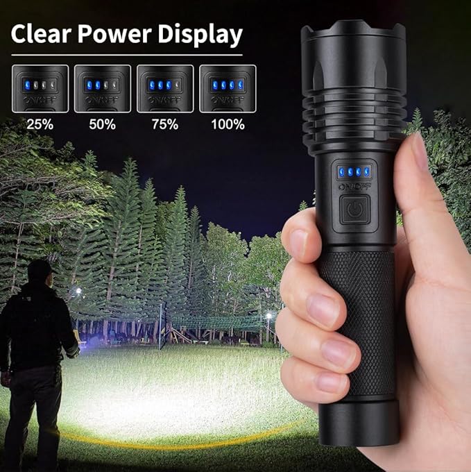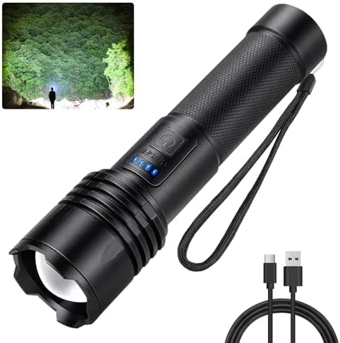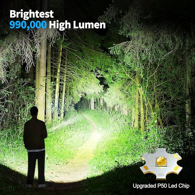 - 990000 High Lumen - The rechargeable flashlight uses a high-brightness led chip, and its brightness is 20 times that of an ordinary flashlight. The maximum brightness is up to 990,000 lumens, which is the best choice for your home, outdoor, camping, hiking.