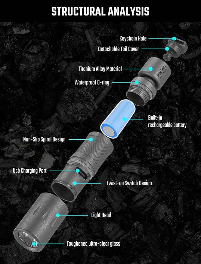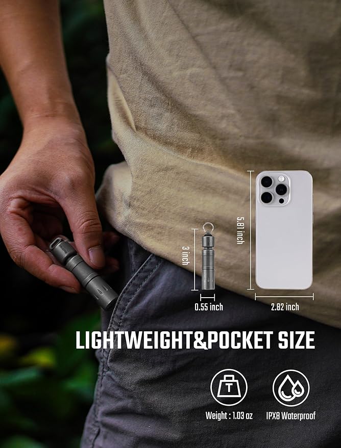 - Lightweight and Sturdy: Weighing just 29.3g and made from durable titanium alloy, our small LED flashlight is both lightweight and tough. Its compact size ensures it fits effortlessly in your pocket, perfect for daily carry and long-lasting use