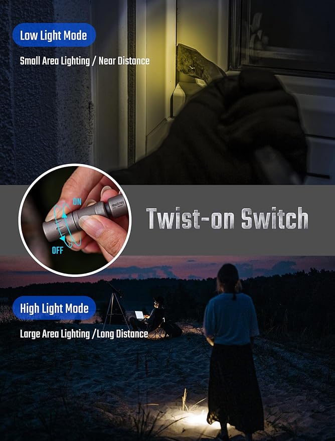 - Simple Twist-on Switch: Operate our small bright flashlight effortlessly with its rotating switch. With two brightness settings, it adapts to various needs, ideal for nighttime adventures, reading, pet care, or quick fixes around the house