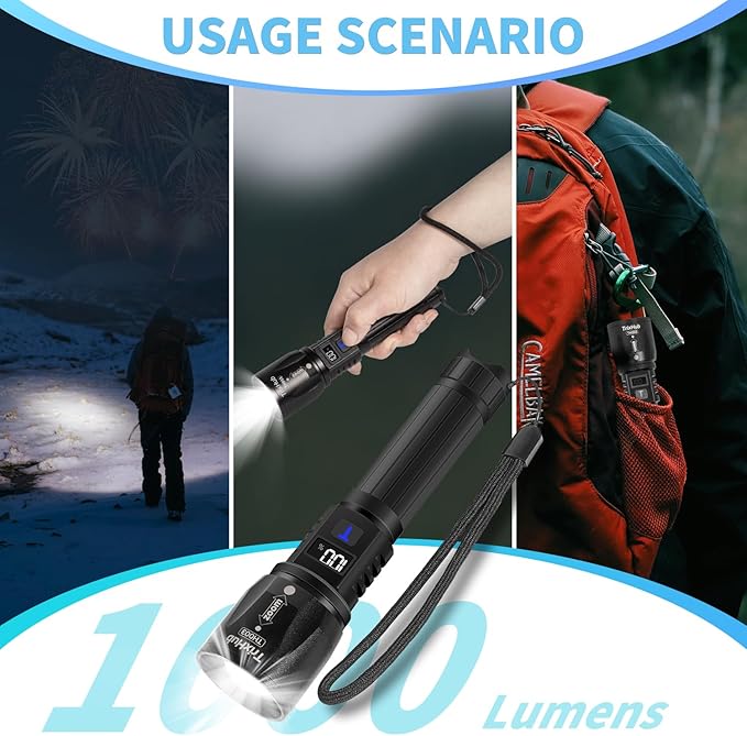 - 【USB-C Port】Super Bright flashlight offers an extended runtime of up to 12 hours on low brightness mode. The USB Type-C fast charging function, which can be fully charged within 2 hours. Saving the cost of disposable batteries and achieving environmental protection. Rechargeable Flashlight LCD display indicates 100% to display the battery power in real-time, so that you always control the status of the flashlight and avoid the trouble of flashlights high lumens rechargeable sudden power outage.