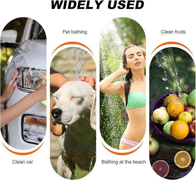- 【Complete Accessories】Equipped with a showerhead, a rinsing nozzle, strong suction cups and hooks, an efficient water pump, a two-meter-long hose, and two leak-proof sealing rings, this device comes with all the necessary accessories for effortless installation and use. Now, you can enjoy a home-like shower experience even when outdoors.