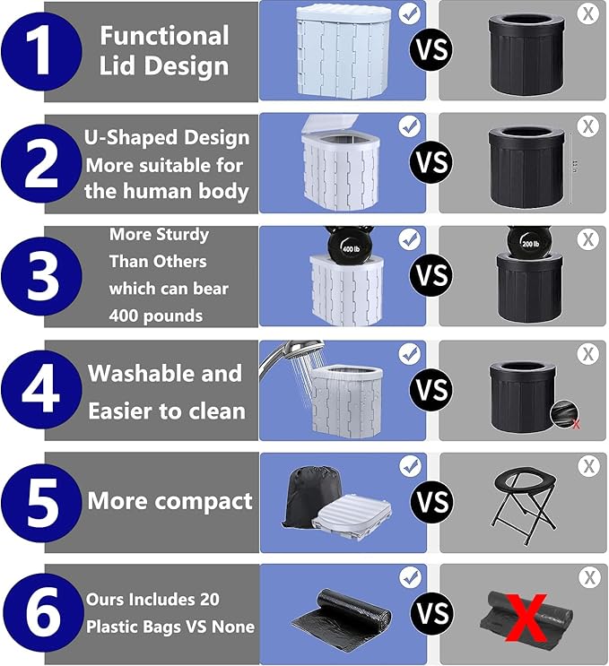 - 🚽【Sturdy and Comfortable Portable Toilet】The newly Portable Toilet is just like the one in your home.It is higher, wider and the seat has more sitting room than the small and older round portable toilet. It makes you feel more comfortable. The size of portable toilet is 11.02"L*12.99"W*11.81"H, folded up size - 11.02''*12.99''*2.68'' is made of premium ABS plastic, is sturdy and can hold up to 400 lbs. It is suitable for adults, kids, male, female, women and all family use.
