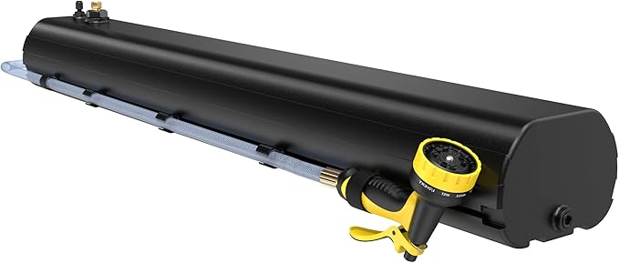 - [Large Capacity and Easily Pressure:] The Pressurized Water Tank is 55.11″long x 8.46″wide x 5.9″high, 33 lbs empty, 89 lbs full. Water tank holds 30L (roughly 8 gallon) water. You can use an air compressor(not included)to easily pressurize the tank, safely top pressurize not higher than 80 PSI
