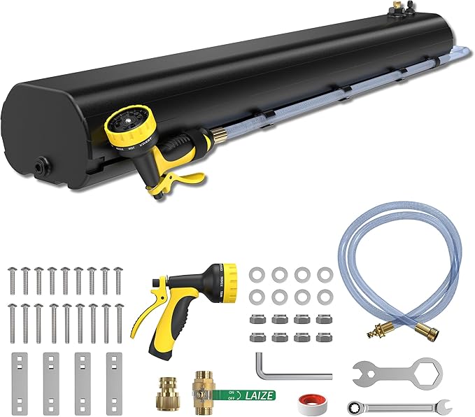 - [Easy Assembly] Including User Instruction Manual, brass fittings, stainless steel mounting hardware, and two 1.3m hoses to help you to assemble. Require a roof rack to complete install and cannot install water rank on one side of the rack.
