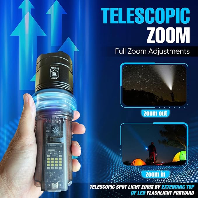 - TELESCOPIC ZOOM - Survival Flashlight Has Full Zoom Adjustments. Telescopic Spot Light Zoom by Sliding the Head of Super Bright FlashLight Forward. Slide Back to Get Wide Flood Light.