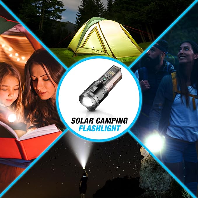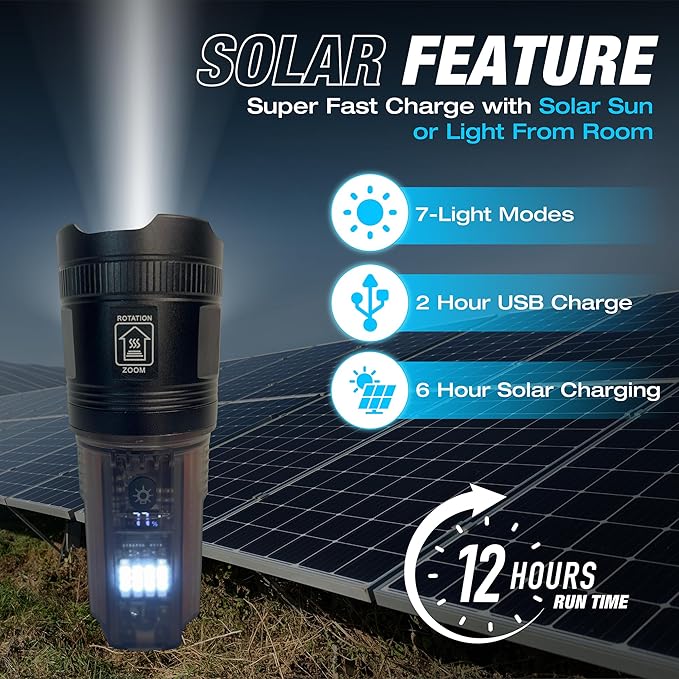 - SOLAR FEATURES - Dedicated Solar Panel on Shaft of LED Flashlight. Super Fast Charge with Solar Sun or Light From Room. Exactly Designed for Flashlights For Emergencies.