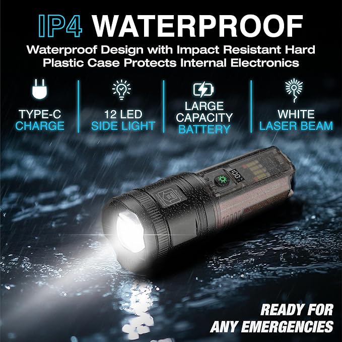 - IP4 WATERPROOF - Safely Carry and Use The rechargeable Flashlight During Camping Trips And Fishing Trips. Water Proof Rubber Button, and Hard Plastic Case Protects Internal Electricals.