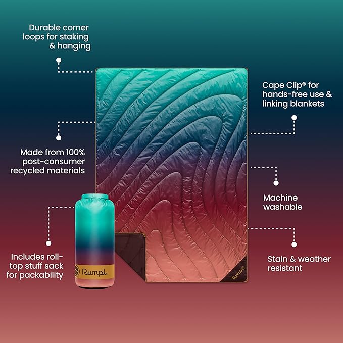 Rumpl Original Puffy Blanket - Warm Puffy Camping Blanket, 100% Recycled Polyester Insulation, Lightweight, Packable, Water-Resistant, Outdoor Puffer Blanket, 52"x75", V2, Arizona Fade