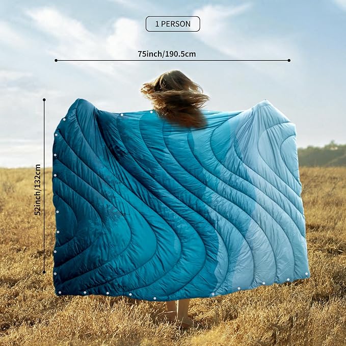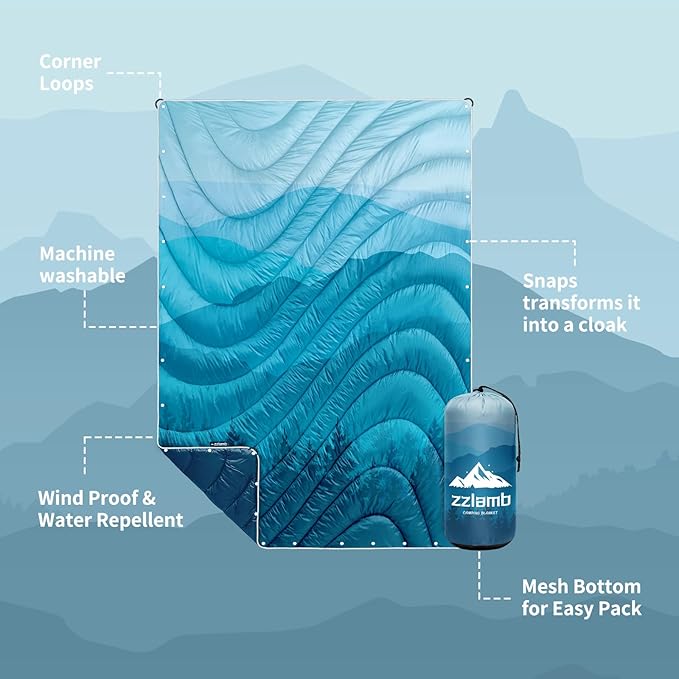 - Functional Designs: The poncho clip or snaps design could transform the puffy blanket into a cloak and make your hands available while you are drinking, eating, chatting or doing some campsite tasks and still keep you warm. Loops at the four corners allow you to stake the camping blanket into the ground and you can use it as a picnic mat and lie down