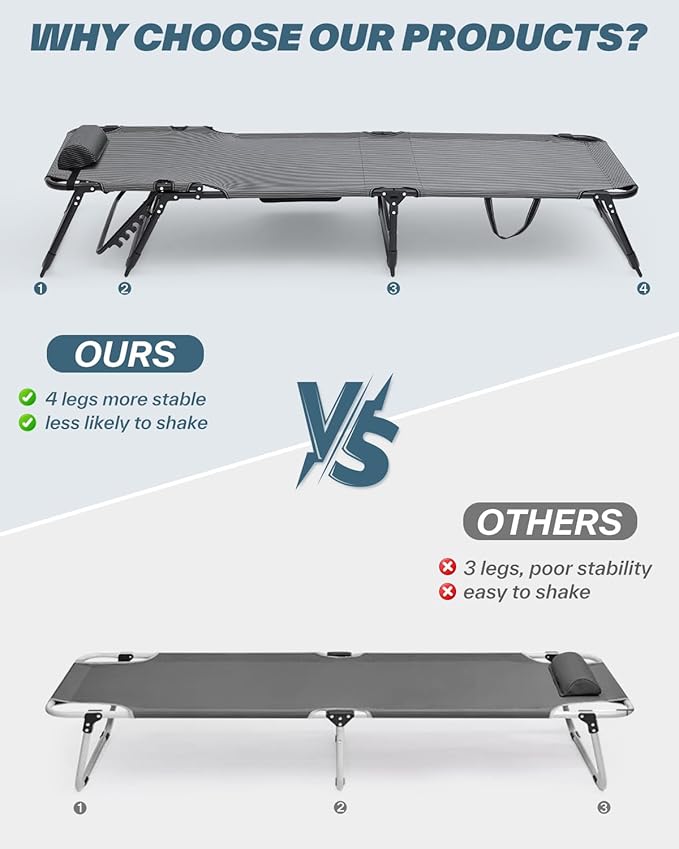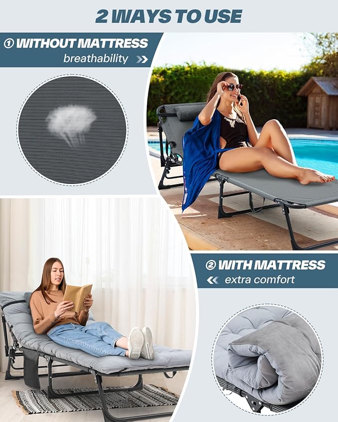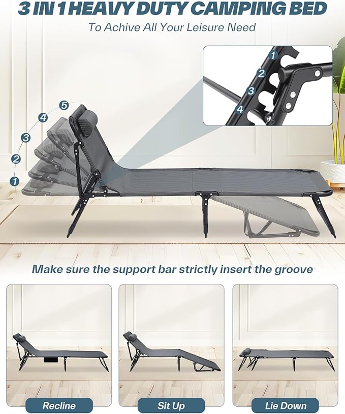 - 5-POSITION ADJUSATBLE LOUNGE CHAIR COT: Sportneer's adjustable chaise lounge integrates versatile functions of reclining, sleeping, and sitting positions into one! You can adjust it to find your ideal angle for optimal comfort and relaxation. Whether you prefer a cozy chair or a plush bed, this cot effortlessly adapts to meet your diverse needs!