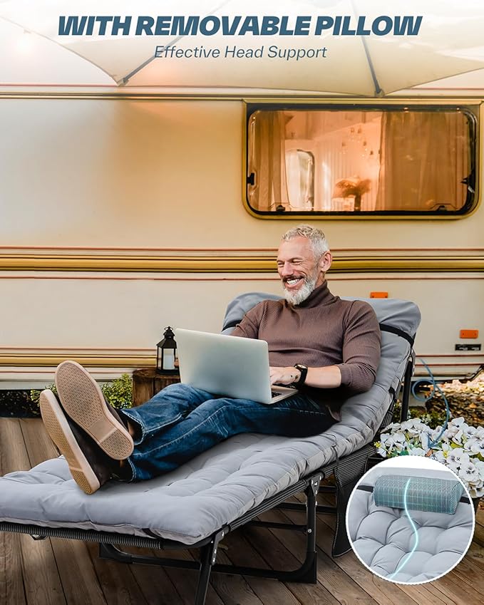 Sportneer Sleeping Cots for Adults: 5-Angle Adjustable Folding Bed with Thick Mattress - 450lbs Max Load Padded Camping Cot with Easy Setup & Takedown for Outdoor Travel Sleep Over, Size 76''x27''