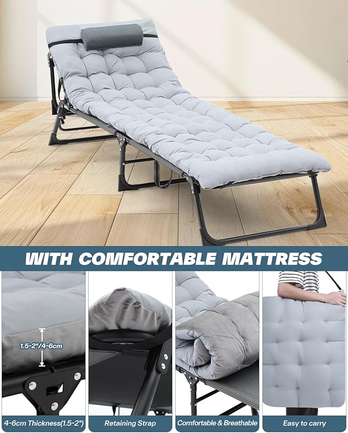 - PORTABLE AND VERSATILE: This folding chair cot bed free assembly, it can be unfolded for use, and can be folded up in 10 seconds. The folding design is easy to store and carry. Ideal for camping, patio relaxation, poolside lounging, balcony leisure, beach outings, travel, office naps, sunbathing, road trip, or as a convenient guest bed when guests visit your home. Enjoy the convenience and versatility it brings to your lifestyle with our cot!