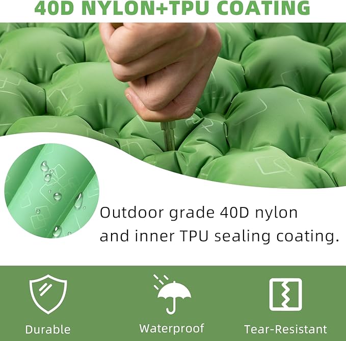 - 【Outdoor Grade Material Different From the Market】:The back of the air mat is 50D nylon polyester + multi-layer TPU , so it won't tear even if you use thick branches. The front of the air mattress is made of sturdy 20D nylon material + multi-layer waterproof and durable TPU material, which is strong, soft, no noise and waterproof, so you can just wipe it down with a towel even in the rain. It can be used for a variety of purposes, such as outdoor mats, camping mats, tent mats, etc.