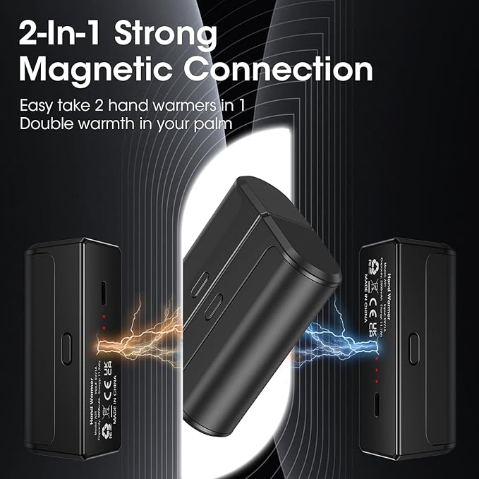 - 【2-IN-1 Magnetic Hand Warmers】This twins hand warmers equipped with a strong magnetic feature that allows you combine them together like palm-sized hand warmer or separate effortlessly.Ergonomic comfort,easy grip,aesthetically pleasing.Safety certified temperature control chip,thousands of polished exterior material smooth and warm,a single button for all operations.Pocket and compact designed incredibly convenient for carrying and storage.Emanating constant heat while keeping the blood flowing.