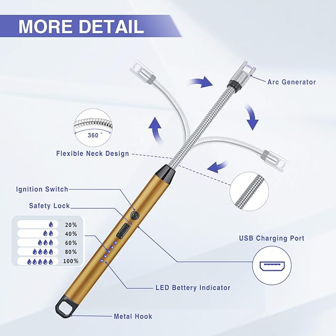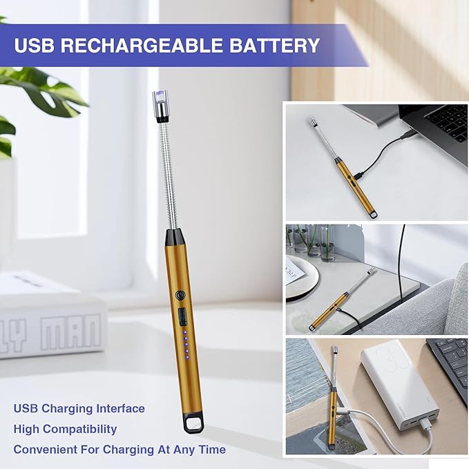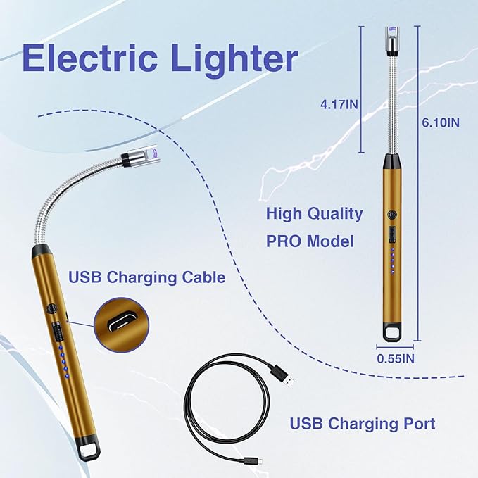 - [BRING YOU A HIGHER QUALITY LIFE]--This USB rechargeable lighter give you a higher quality of life, as it does not produce pungent gases and is compact and portable. Meanwhile, the windproof design makes it unaffected by rain, snow, strong winds and other inclement weather, electric lighter perfect for outdoor, camping, barbecue.The 360 ° flexible rotating long neck design reduces unnecessary worries by lighting aromatherapy, candles, and fireplaces in daily life.