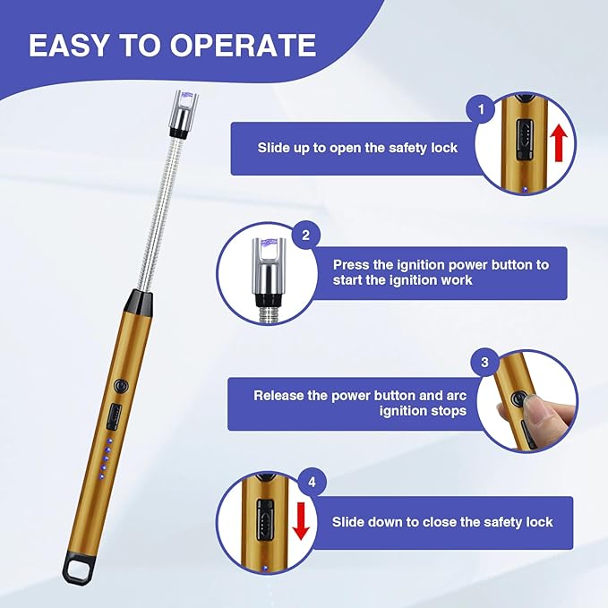 - [YOUR SAFETY IS OUR CORE CONCEPT]--The candle lighter adopts plasma arc and flame-less technology, with no oil, gas, or flame design is safer than ordinary fuel lighters. It not only adds a safety switch lock that prevents children from accidentally touching it, but also sets the function of automatic power-off every 10 seconds, which can effectively stop over-discharging or overloading, providing a guarantee for your safety.