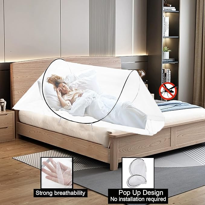 • No installation, ready to use: Pop-up mosquito nets are very easy to install because they pop into place when you take them out of the bag. Also, You just need 6 steps to fold and stored as a circle with a diameter of approximately 13.38 inch(34 cm)