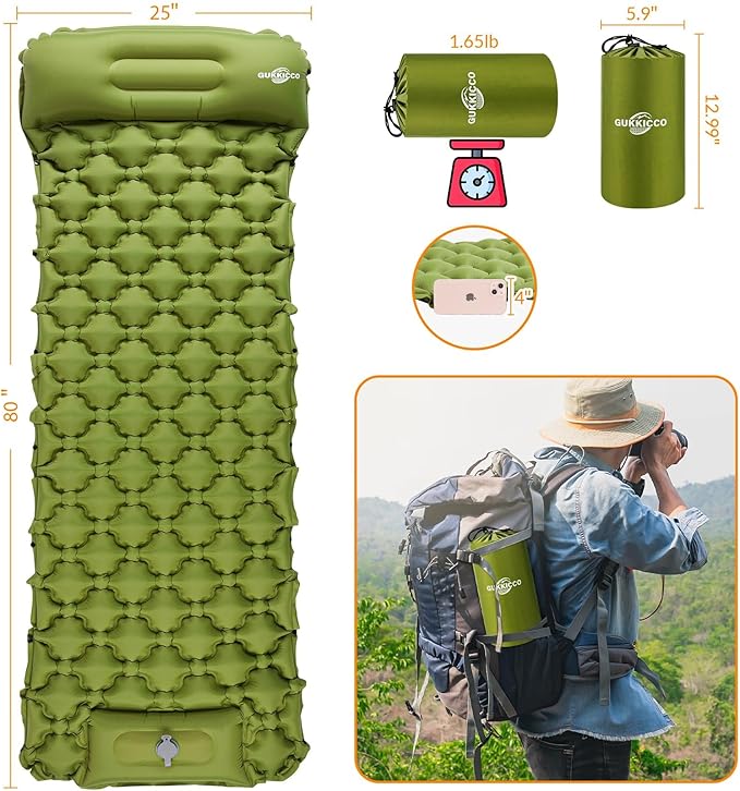 Sleeping Pad Ultralight Inflatable Sleeping Pad for Camping, 80''X25'', Built-in Pump, Ultimate for Camping, Hiking - Airpad, Carry Bag, Repair Kit - Compact & Lightweight Air Mattress (Green)