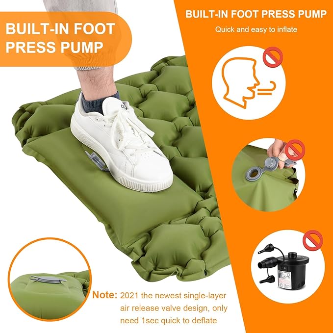- 【Foot Press to Inflate-Only 1 min Needed 】 Camping sleeping pad is no need to inflate with your hands, mouth, or a pump for our camping sleeping pad. It just only takes 1min after you inflate the sleeping mat fully by stamping the spot of the built-in pump with your foot.With anti-leakage films in the valves, you would never worry about air leaking when using it! Besides, super quick to deflate - take out the deflation plug.It's time to plan a camping and hiking with our innovative camping sleeping pad now!