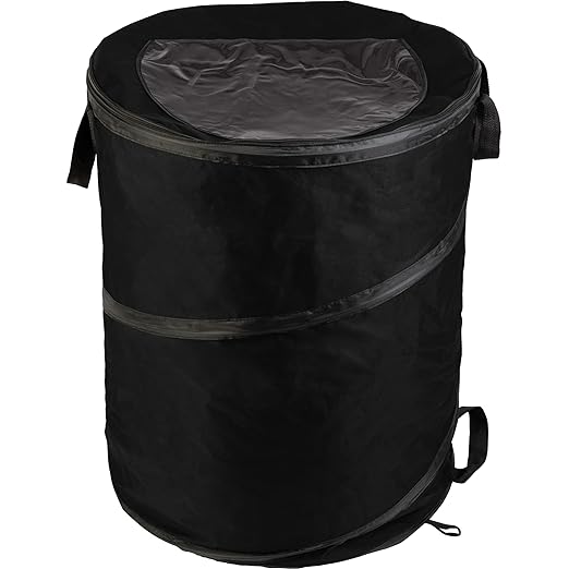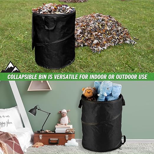 - POP UP TRASH CAN - Keep your campsite, yard, or RV tidy with this camping trash can collapsible bin. The spring built into this outdoor garbage can allows it to pop up to full height in seconds, so it’s ready to get to work wherever adventure takes you.
