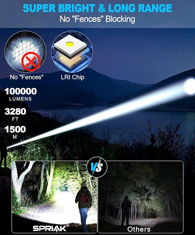 - SUPER BRIGHT & LONG RANGE: The flashlights high lumens rechargeable adopts a high-efficiency LRI(Long Range Illumination) LED chip with a maximum output of 100,000 high lumens, a wider range of illumination, a longer lighting distance up to 3,280FT(1,500m). The service life is up to 90,000 hours. Produces light that is more focused, brighter and farther than the XHP70.2, XHP90 traditional rechargeable Led flashlight,also no "fence" to prevent you from seeing distant objects clearly.