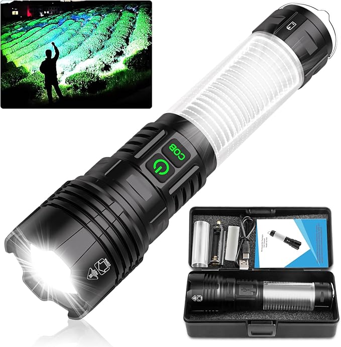 - 7 MODES & TELESCOPIC ZOOM: This Rechargeable led flashlights have 7 lighting modes: High/Low/Strobe/SOS/COB High/COB Low/Main Light+COB Light(turn on together). 2 switches control the main light and COB flash light respectively. This high lumen tactical flashlight has adjustable focus design, easily change between floodlight and spotlight. Tips: Press 3 second to turn off the LED flashlight at any mode, no need to cycle through all mode.