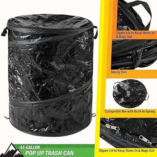 - POP UP TRASH CAN - The outdoor garbage can is perfect for indoor or outdoor use, offering an ideal way to clean up after a party while reducing your impact on the environment. The zippered lid makes it easy to carry around without spilling its contents.
