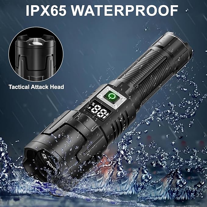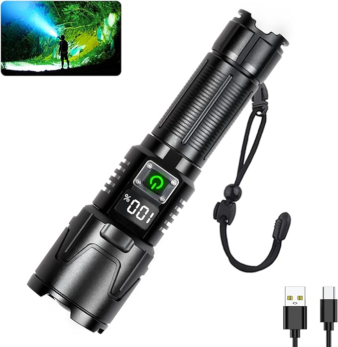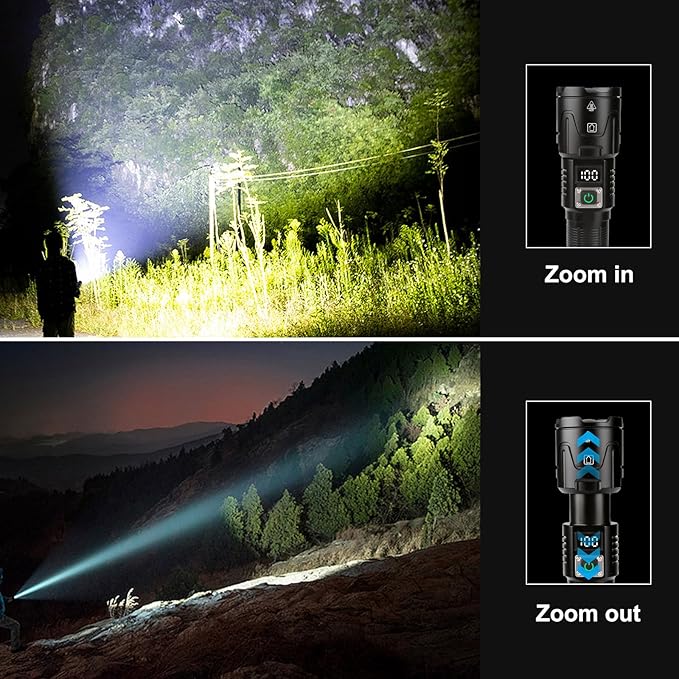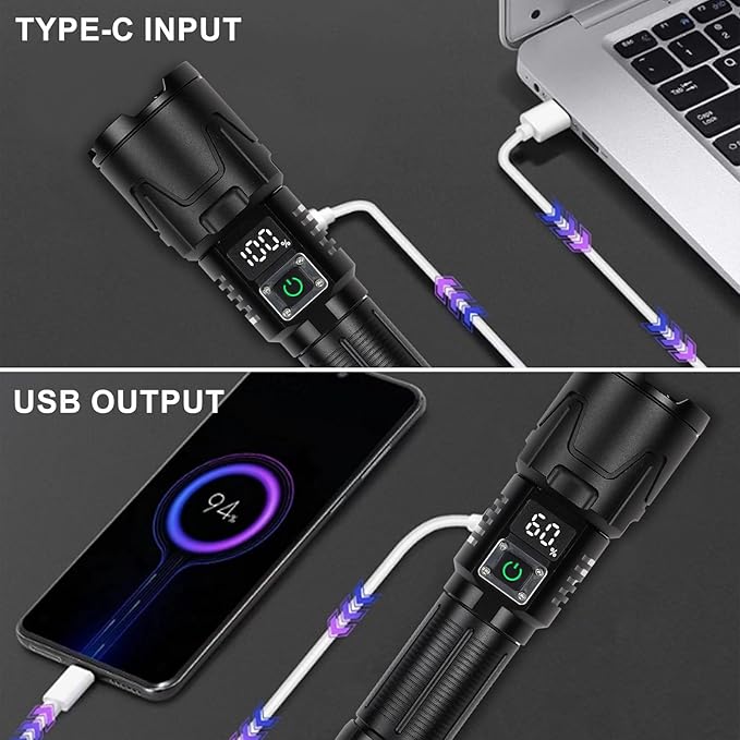 - DIGITAL POWER DISPLAY & POWER BANK - Our rechargeable flashlight comes with digital power display, which helps you accurately grasp the remaining power, so you'll never be left in the dark unexpectedly. The flashlights high lumens has a built-in USB output port that serves as a mobile power bank to charge mobile phones and other devices.