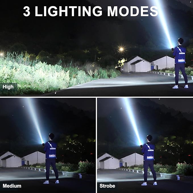 - UPGRADED FLASHLIGHTS HIGH LUMENS - The rechargeable flashlights is equipped with an upgraded LED chip, and the maximum brightness is up to 4500 lumens, bringing you dazzling brightness. Its lighting range is wider and farther, with a maximum lighting distance of up to 3000 feet, making everything before you becomes bright and clear, protecting you from the dark and unknown. A must-have super bright flashlight for outdoor, camping and hiking trips.