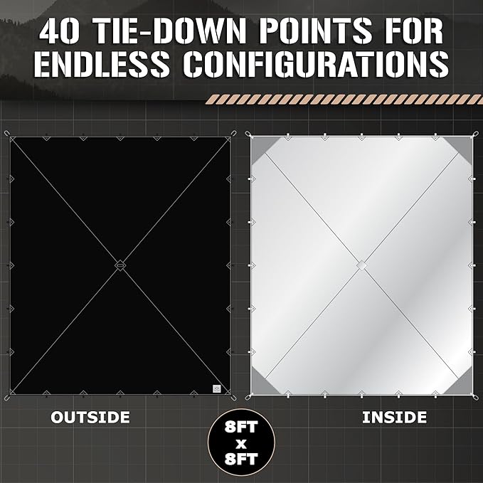 - ELEVATED OUTDOOR FUNCTIONALITY - Stay warm, cozy, and protected from the elements with our survival tarp´s reflective inner coating. It reflects body heat and campfire heat back towards you to keep you toasty, while also blocking the suns rays to prevent overheating.