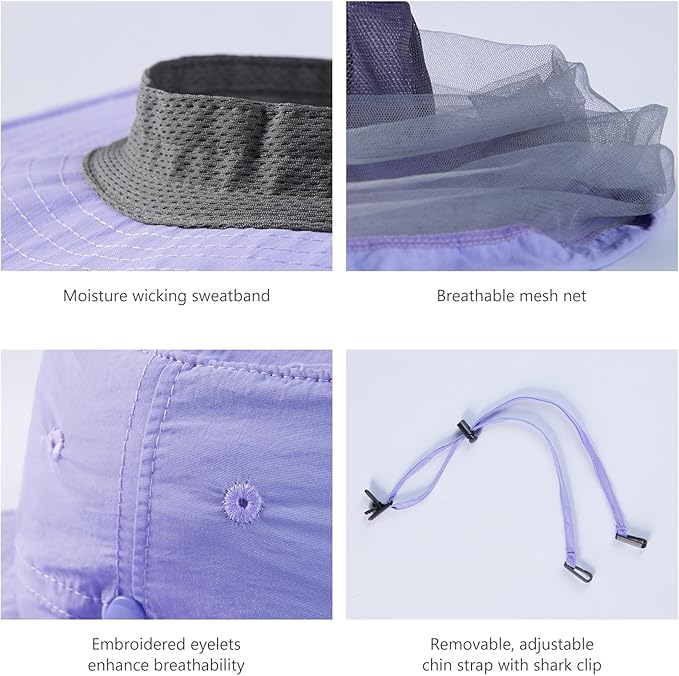 • Built-in sweatband prevents sweat from getting into your eyes; Embroidered eyelets facilitate breathability; Removable, adjustable chin strap with locking toggle ensures the hat works well on windy days, and with a shark clip on the strap, the hat can be attached to your other gears (like backpack, clothes, etc.) when not in use