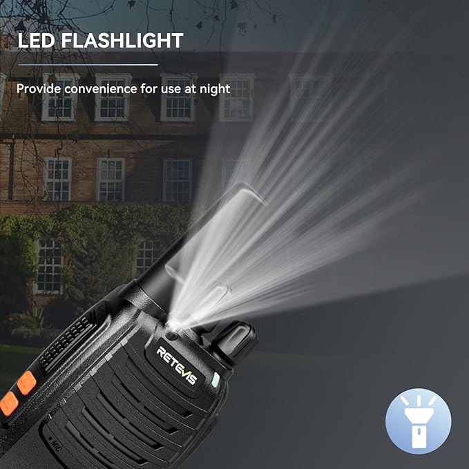 - LED flashlight; radios walkie talkie lights your way when you go home or play at night; shortly press the side key 2 to turn on