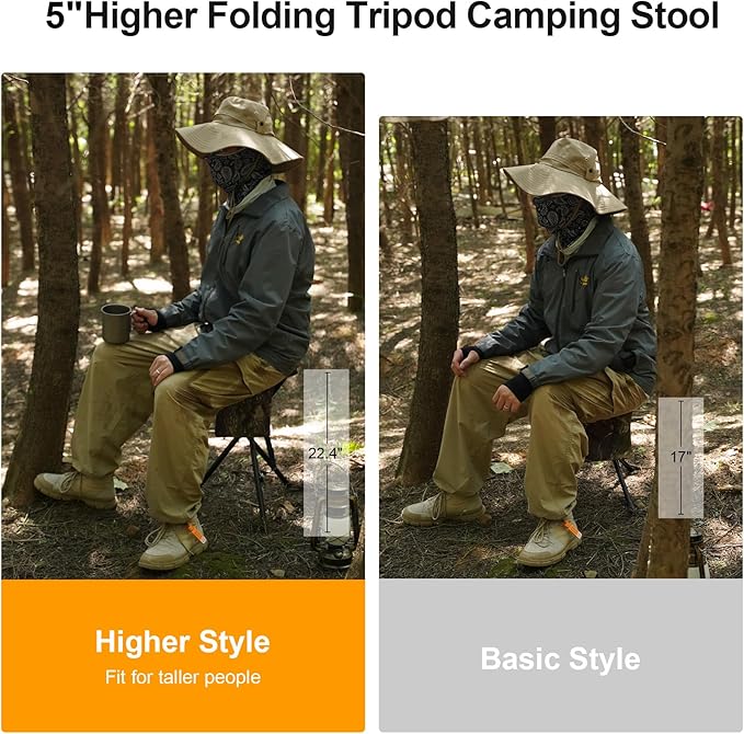 - [Taller Heights] Available 2 heights in17 inch high and 22 inch high, the taller folding camping stools are 3 inches higher than the present big style in the market. Providing more comforts on your knees when sitting.
