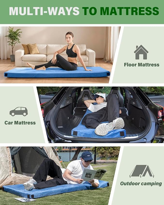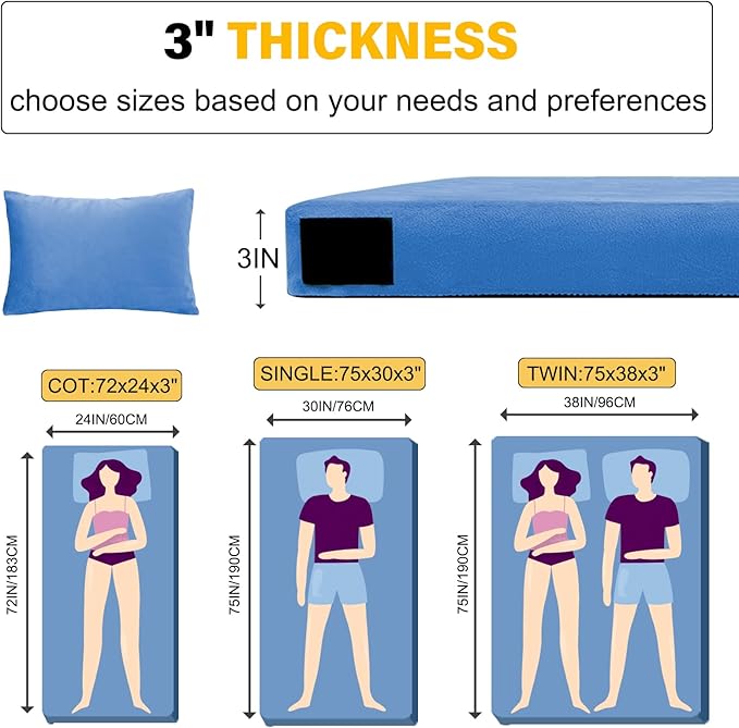 - Memory Foam Camping Mattress:The 3-inch thick memory foam mattress pad consists of 2 inches of high-density support foam and 1 inch of memory foam.Provides balanced support and comfort,with the high-density foam offering stability and the memory foam delivering pressure relief