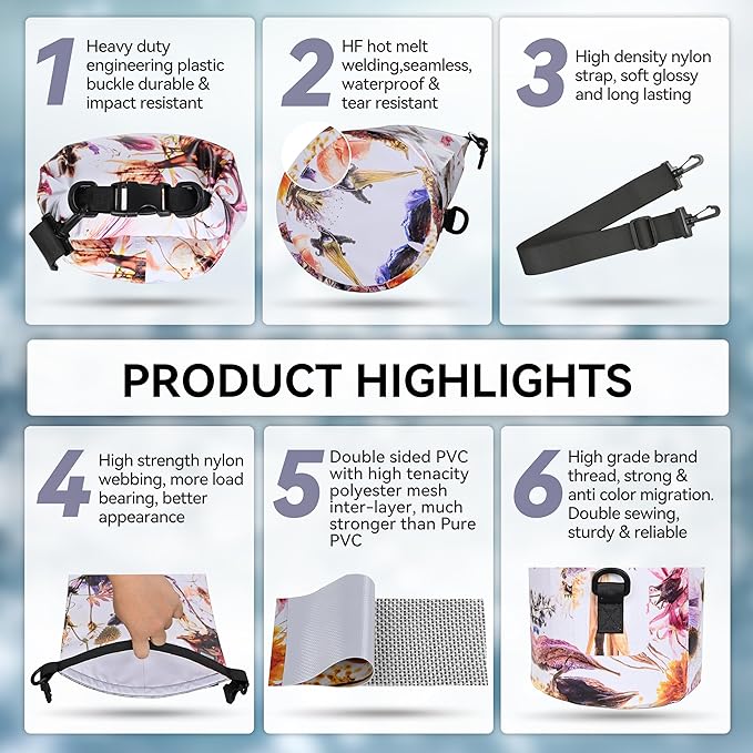 • Floatable and Trackable: The dry sack can float on water without sinking after being rolled up and buckled, so you can quickly track and retrieve your stuff. The D-ring and strap on the bag make it easy to attach to the boat, keeping your stuff always with you without getting lost, allowing you to enjoy thrilling outdoor activities with peace of mind.