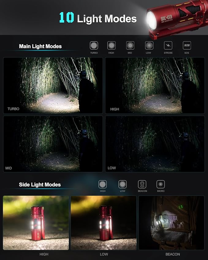 - [ Multi Lighting Modes ] 10 lighting modes all controlled by one button. From bright beams for outdoor adventures to eyes friendly side light for reading at home, this small flashlight caters to a variety of scene requirements.
