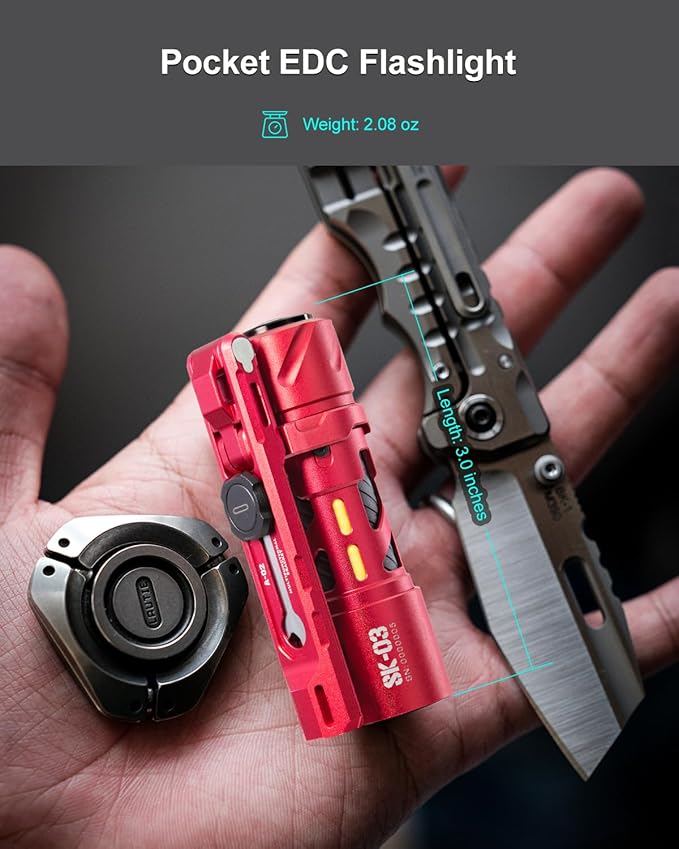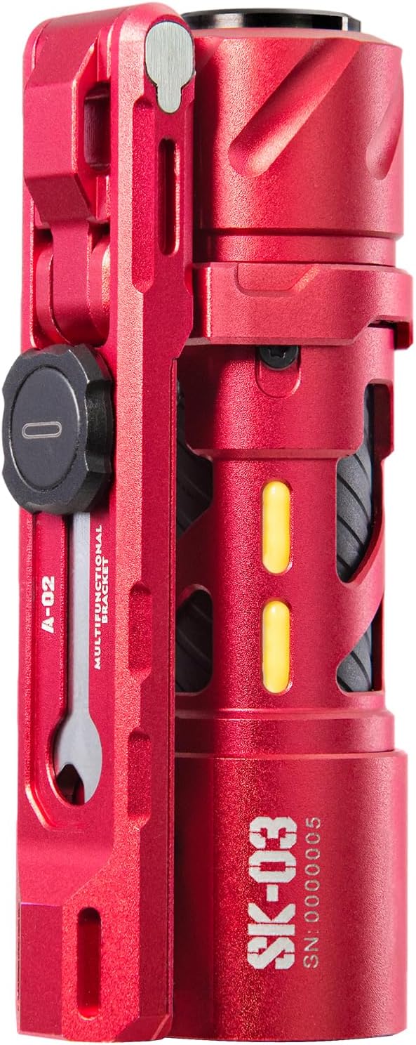- [Multifunctional Use] The SK03 Pro EDC Flashlight comes with a magnetic suction bracket that allows you to easily adjust the angle of illumination and flexible use. It also features a built-in knife and bottle opener for added convenience during camping trips.