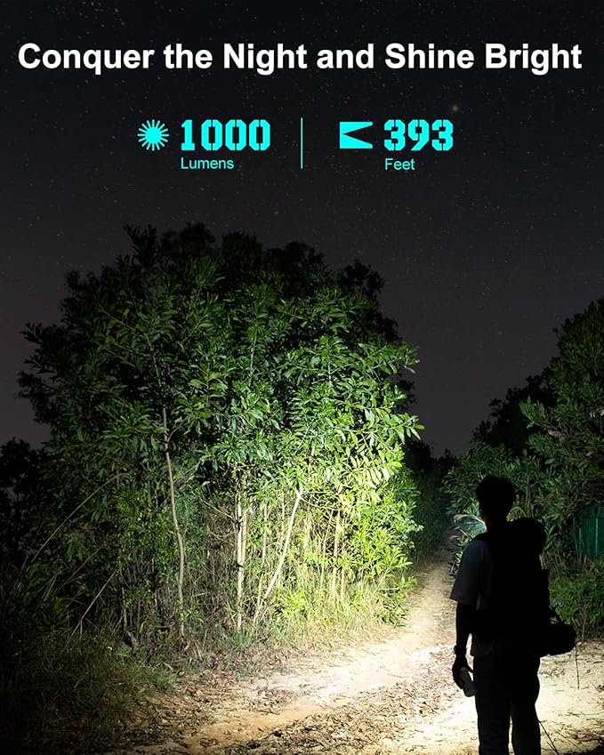 - [ Powerful SK03 Pro Flashlight ] Experience exceptional visibility with our ultra-bright 1000 lumens flashlight, offering a 145° floodlight angle that can illuminate up to 393 feet.