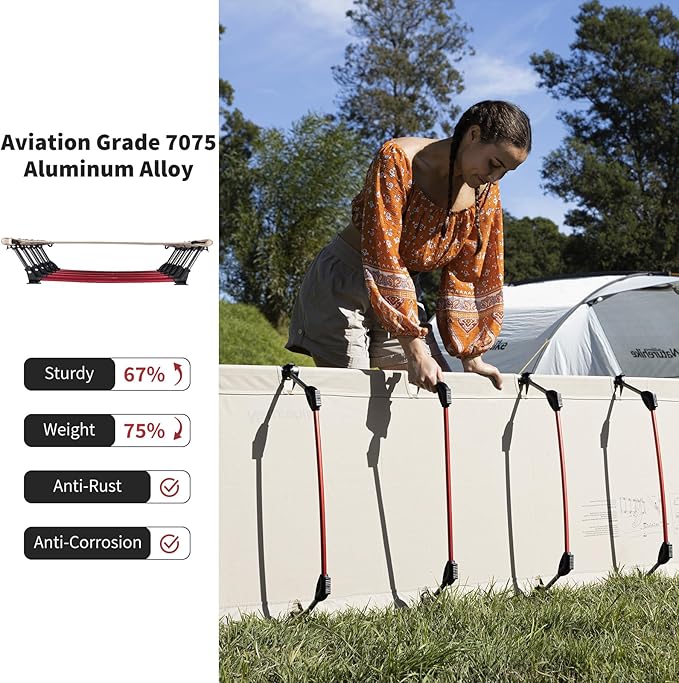 - 【STURDY & RELIABLE】The Camp Cot is made of aircraft-grade 7075 aluminum alloy, which is 67% stronger than ordinary aluminum alloy. The tent cot has a total of 5 support legs and can provide more support than 3 legs. It easily supports 330 lbs while keeping the bed flat and preventing it from sinking