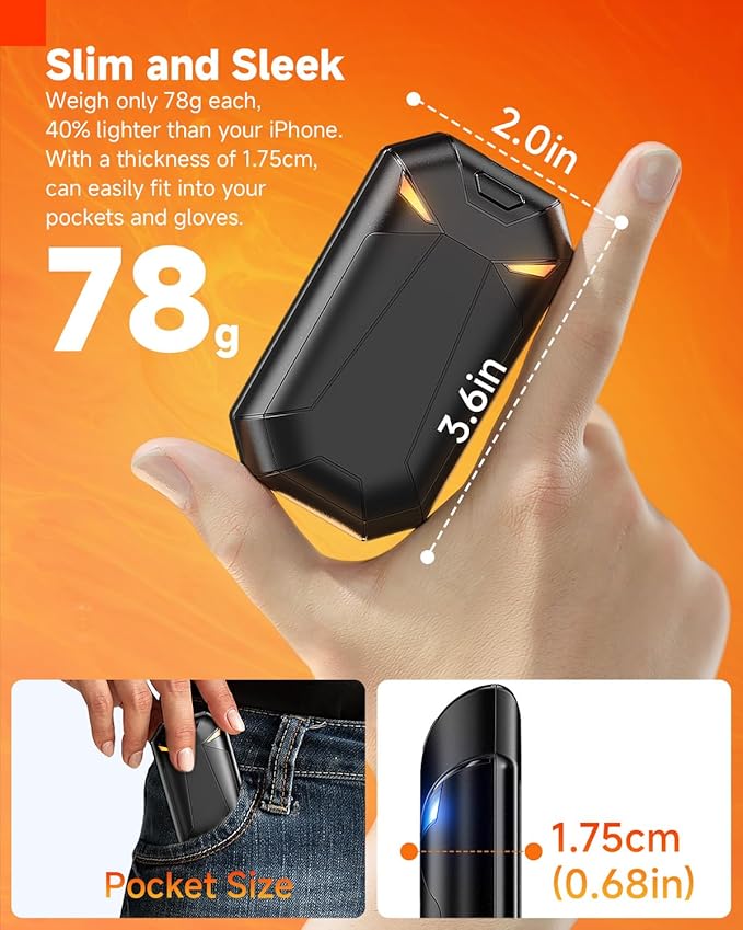 - 【Ultra-Light and Thin】- The electric hand warmers weigh 78g each and are only 1.53cm thick. With natural curves and a comfortable, delicate touch, they fit snugly in your palm and easily warm up for hours.
