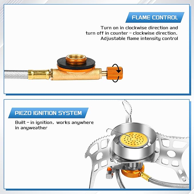 - Convenient Piezo Ignition & Flame Control: Featuring easy-to-use piezoelectric ignition, simply connect the fuel tank, turn the gas switch, and press the ignition button. The adjustable flame knob lets you customize the flame size for precise cooking.