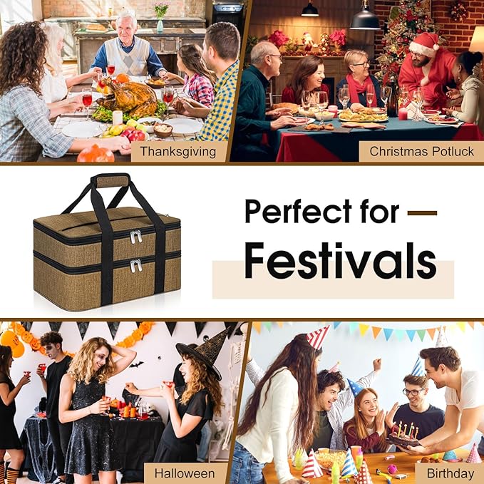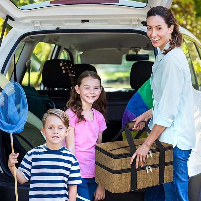 - Details: The casserole dish carrier bag adopt double zipper design, easy to open and close; The internal aluminum film not only holds heat but easy wiped clean with paper towels when encountering dirt; Note: Not machine washable