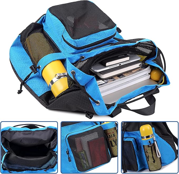 - [Large Space] - Size: 13 X 6.7X 18.1 inch, It's perfect for storing and organizing all your fitness equipment and change of clothes. Large capacity mesh backpack Design Keeps sand and water away for quick drying, allows you to find what you need quickly, such as toys, beach towels, shoes, swimsuits, sunglasses, goggles, snacks and etc.